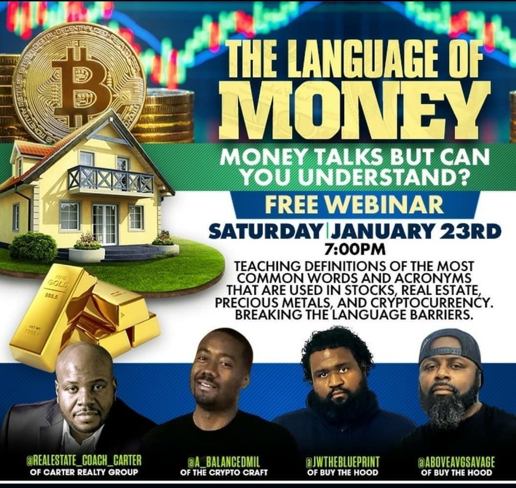 This is a recording of a webinar where we discussed the language of money. One of the biggest barriers to learning to invest is language. We talk about the most common words, definitions and acronyms used when discussing real estate, the stock market, cryptocurrency, and precious metals. We are breaking down every barrier to building black wealth. Doing our part to reduce this wealth gap.